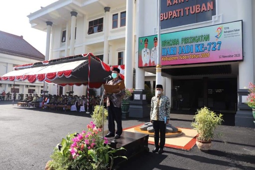 Bertindak selaku Inspektur Upacara, Bupati Tuban, H. Fathul Huda menyampaikan peringatan HJT ke-727 menjadi momentum mengevaluasi program dan capaian Pemkab Tuban dalam memberikan pelayanan masyarakat Kabupaten Tuban.