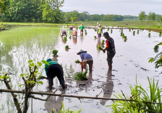 Dengan tidak merasa canggung, meski berpakaian dinas resmi, Serda Ahmad Wibowo, menyingsingkan celana dan berbaur turun langsung bersama para petani di areal persawahan milik Poktan Karya Utama Dusun Bakalan Desa Gapluk Kecamatan Purwosari. Penanaman padi ini disesuaikan dengan penyuluhan dan arahan dari Dinas Pertanian setempat.