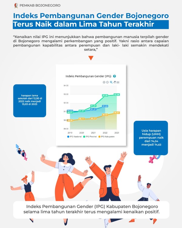 “Kenaikan nilai IPG ini menunjukkan bahwa pembangunan manusia terpilah gender di Bojonegoro mengalami perkembangan yang positif. Yakni rasio antara capaian pembangunan kapabilitas antara perempuan dan laki- laki semakin mendekati setara,” terangnya.