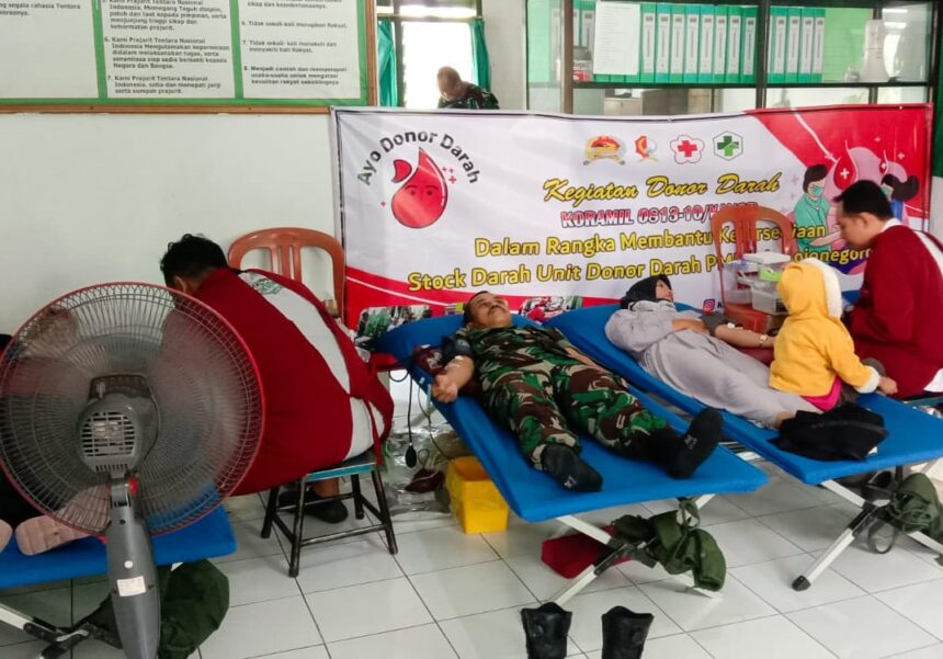 BOJONEGORO , arsip.bhantaran.com – Wujud kepedulian dan solidaritas terhadap kemanusiaan, Komando Rayon Militer (Koramil) 10/Kanor Kodim 0813 Bojonegoro menggelar kegiatan bakti sosial donor darah bekerjasama dengan Palang Merah Indonesia (PMI) Bojonegoro, Jawa Timur, Rabu (24/4/2024).