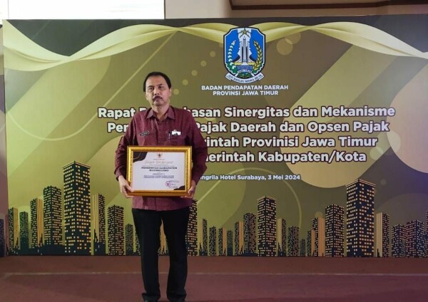 BOJONEGORO, arsip.bhantaran.com – Pemerintah Kabupaten (Pemkab) Bojonegoro meraih peringkat 3 atas Kepatuhan Pembayaran Pajak Kendaraan Dinas. Penyerahan apresiasi dilaksanakan bersamaan dengan Rapat Sinergitas Pemungutan Pajak Daerah dan Pajak Opsen, Jumat (3/5/2024) di Sangrila Hotel Surabaya. Kegiatan ini diselenggarakan oleh Pemerintah Provinsi Jawa Timur.