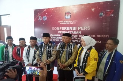 Bakal Calon Bupati Tuban 2024-2029, Aditya Halindra Faridzki dalam konferensi persnya menyampaikan, pendaftaran dirinya bersama partai pengusung hari ini berjalan lancar sesuai aturan KPU.