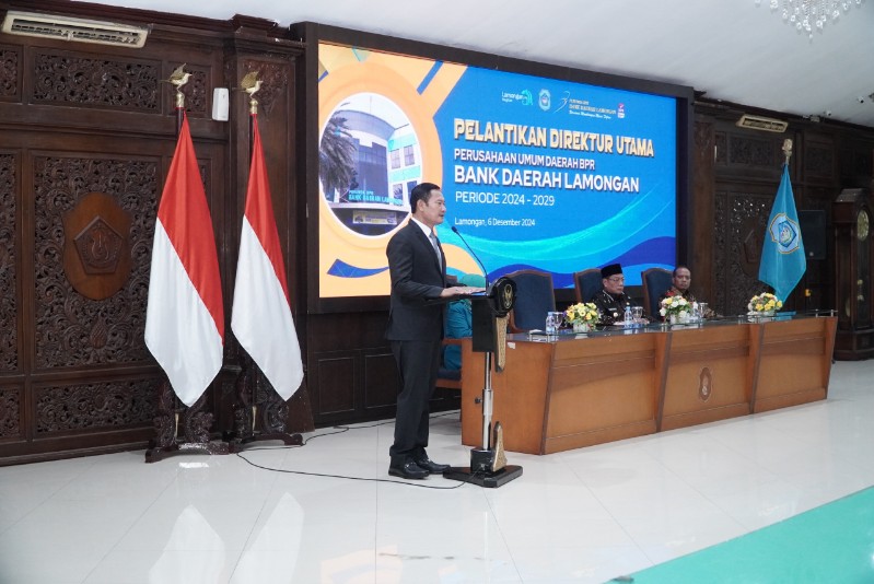 LAMONGAN, bhantaran.com – Lamongan Yuhronur Efendi Lantik Direktur Utama Perusahaan Umum Daerah Bank Perkreditan Rakyat Bank Daerah Lamongan (BDL) periode 2024-2029 Nur Rahmawati, Jumat (6/12) di Pendopo Lokatantra.