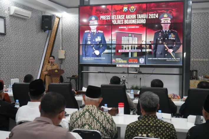 BOJONEGORO, bhantaran.com – Pj Bupati Bojonegoro hadiri Press Realese Akhir Tahun 2024 di Mapolres Bojonegoro, Selasa (31/12/2024). Dalam kesempatan tersebut Adriyanto menyampaikan ucapan terimakasih atas sinergitas dan dukungan Polres Bojonegoro dalam menjaga stabilitas di masyarakat, baik di sektor politik, sosial dan ekonomi.