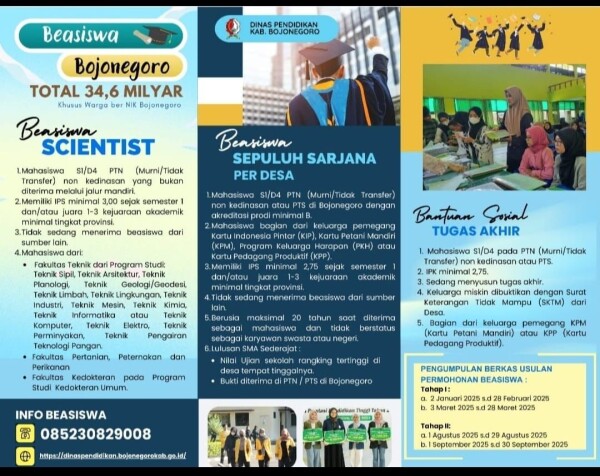 Saat dikonfirmasi Jumat (21/2/2025), Sekretaris Dinas Pendidikan Kabupaten Bojonegoro Anang Prasetyo Adi menyampaikan bahwa jumlah pagu anggaran sama seperti tahun sebelumnya. Begitu pula dengan jenis beasiswa yang disediakan yakni beasiswa scientist, beasiswa 10 sarjana perdesa dan tugas akhir.