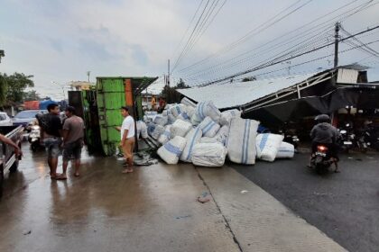 LAMONGAN, arsip.bhantaran.com - Hilang Kendali akibat jalan Licin Mobil Bermuatan barang jasa…