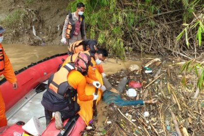 Terlihat BPBD Tuban sedang mengevakuasi mayat mengapung di sungai Bengawan Solo, desa…